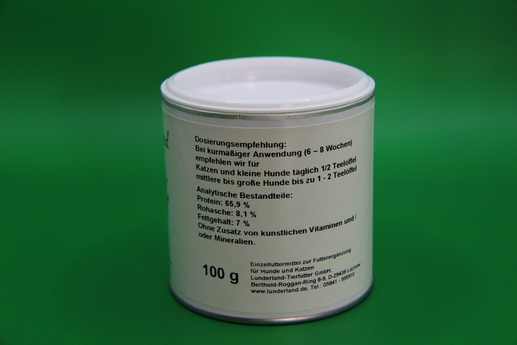 Das getrocknete Pulver enthält bis zu 70 % hochwertiges, leichtverdauliches Eiweiß mit nahezu allen essentiellen Aminosäuren. Sie eignet sich somit hervorragend zum Energielieferanten bei erhöhten Ansprüchen an die Aktivität des Tieres.